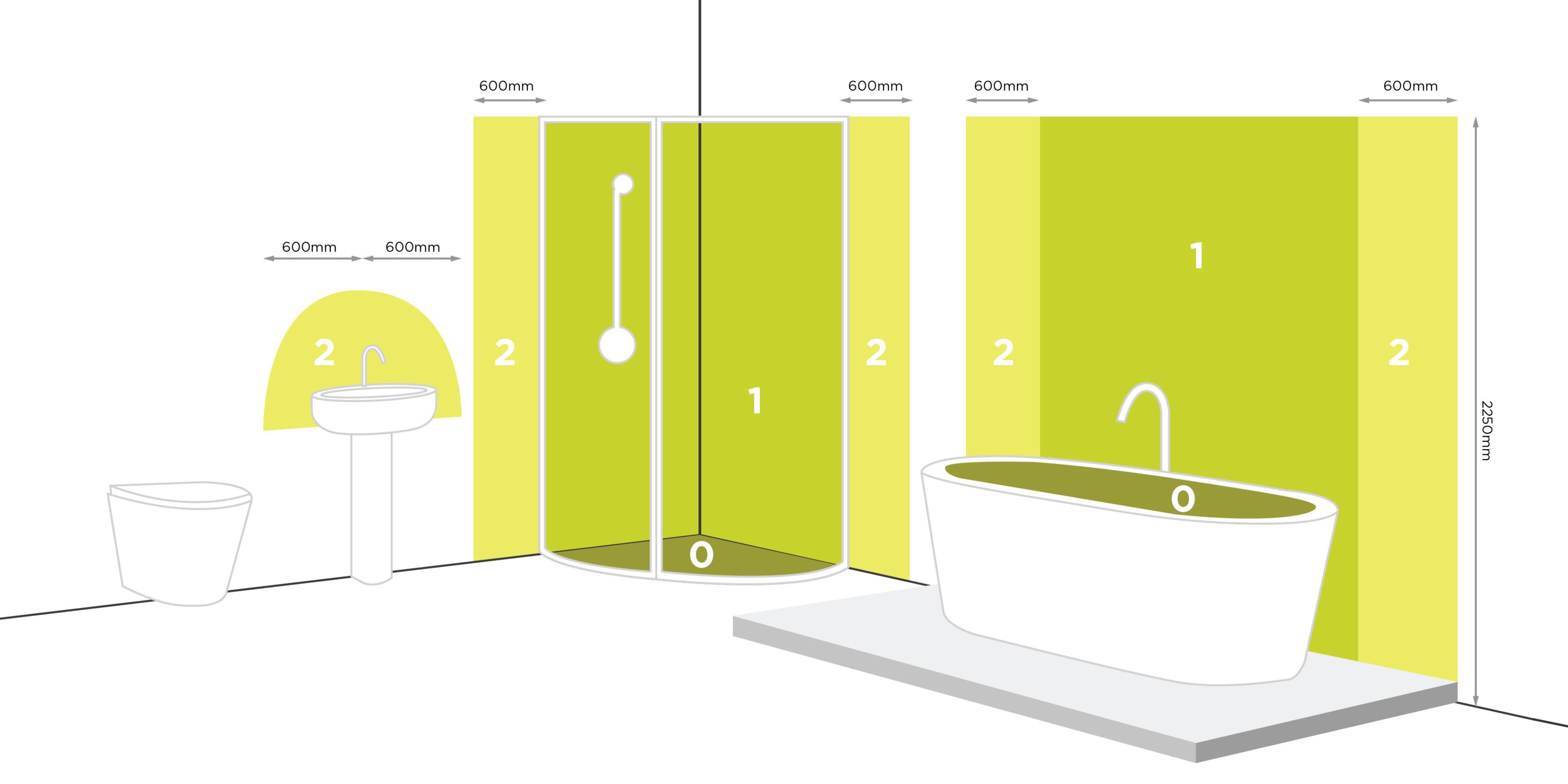 Une salle de bain est composée de zones différentes en fonction de la proximité des sources d’eau, chaque zone nécessitant un indice IP de protection minimale contre les corps liquides.