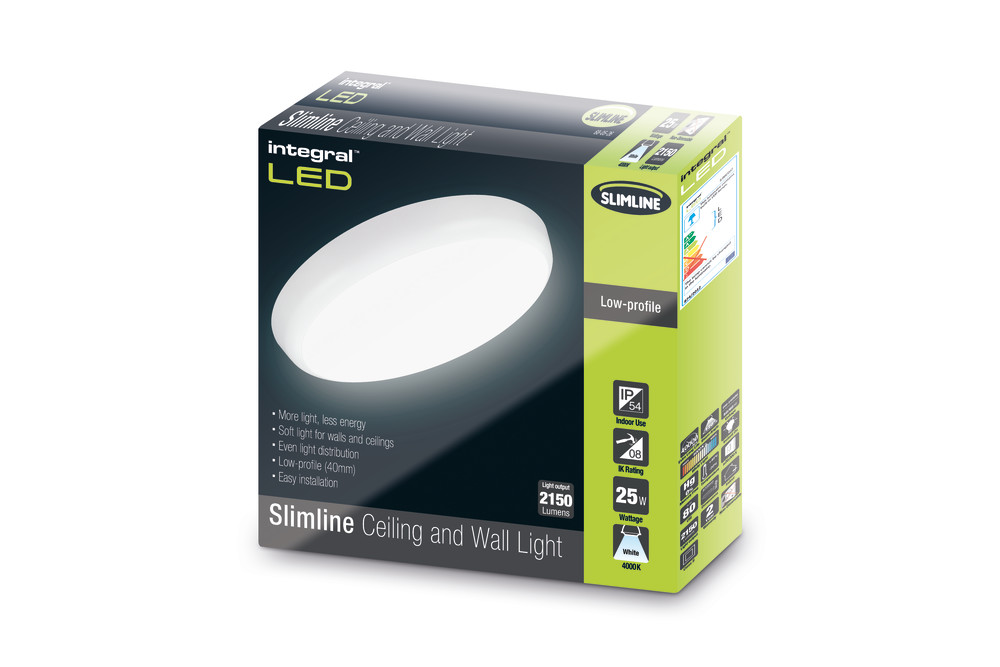 L'applique murale et plafonnier à faible consommation d'énergie Integral LED 25W fournit 2150 lumens, une température de couleur blanche de 4000K. Son design LED rétro-éclairé offre un angle de faisceau de 120 degrés et une répartition uniforme de la lumière. Le plafonnier et l'applique murale Integral IP54 Slimline ont une profondeur de profil bas de seulement 40 mm et conviennent à toutes les zones intérieures telles que les couloirs, les escaliers, les murs et les plafonds, y compris les salles de bains (zones 2 et 3) et les zones extérieures couvertes (abritées), telles que porches. Fabriqué en polycarbonate résistant et de haute qualité. Longue durée de vie de 40 000 heures basée sur une utilisation normale. Chaque unité est fournie avec un support d'installation facile et un guide d'installation facile à suivre.