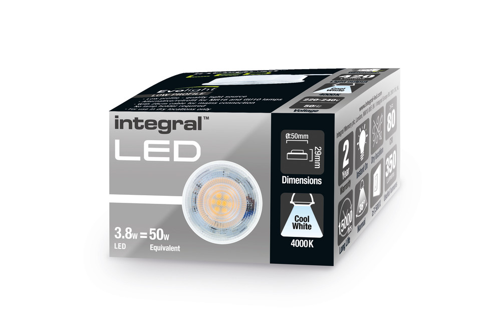 L'Integral LED Evolight est une innovation technologique en matière d'ampoule. Cette solution pré-câblée 240 V remplace votre lampe MR16 12 V, sa douille et son transformateur, ainsi que votre GU10 240 V et sa douille. Son profil très bas, seulement 29 mm de hauteur, évite les obstacles dans le vide du plafond. Le câble de 28 cm fourni facilite l'installation. L'Integral LED Evolight est une source lumineuse à intensité variable de qualité, idéale pour tout downlight sans douille (compatible avec les modèles non gradables) et peut également être utilisée en combinaison avec l'Integral LED Evofire+."