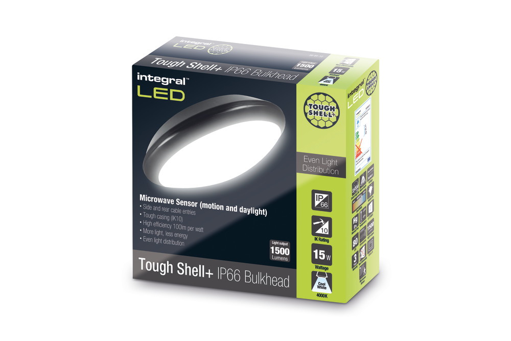 TOUGH SHELL+ BULKHEAD MICROWAVE SENSOR 308MM DIA IP66 1500LM 15W 4000K IK10 110 BEAM NON-DIMM BLACK 100LM/W INTEGRAL