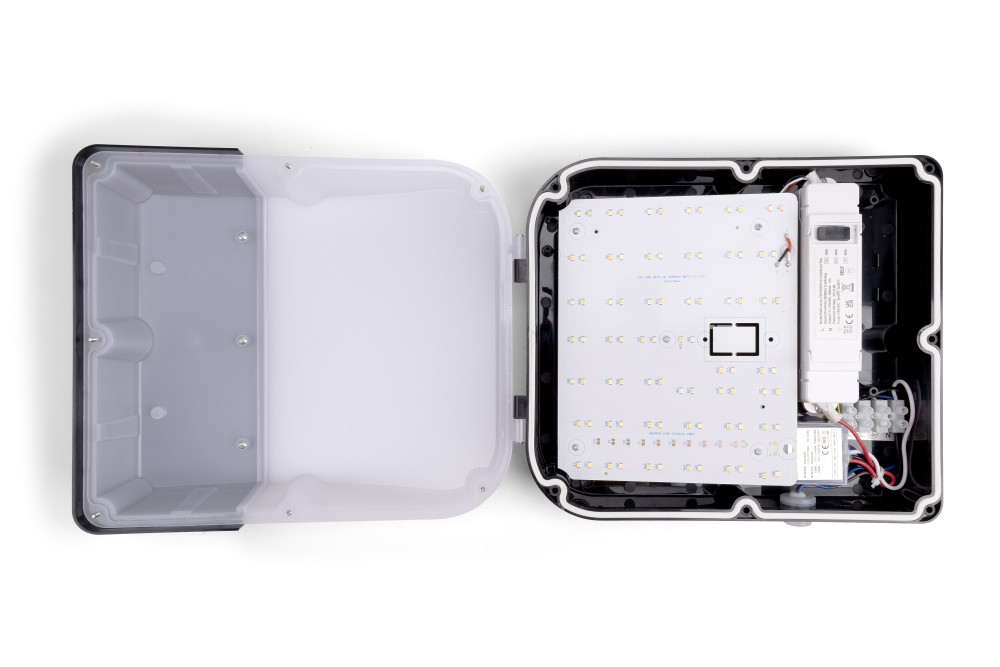 Le luminaire est doté d'un corps en polycarbonate qui offre une protection IK10 et IP65, ce qui le rend suffisamment robuste pour les installations les plus exigeantes. Adapté aux environnements intérieurs et extérieurs, il offre des options CCT commutables de 3000K, 4000K et 6000K, ainsi que des réglages de puissance réglables pour répondre aux différentes exigences d'application.