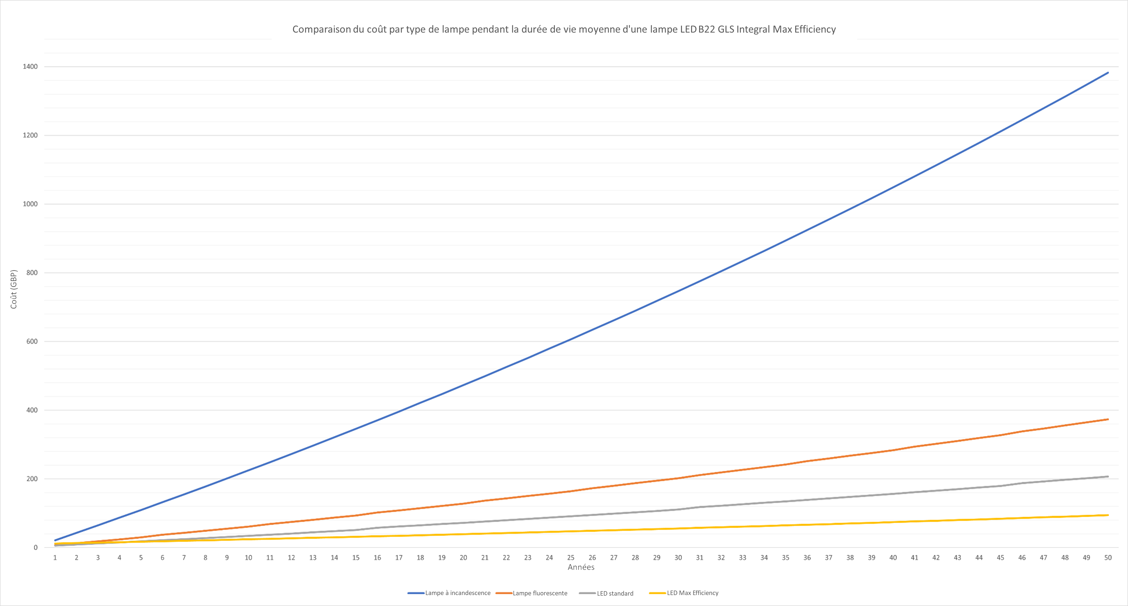 Comparaison du coût par type de lampe pendant la durée de vie moyenne d'une lampe LED B22 GLS Integral Max Efficiency