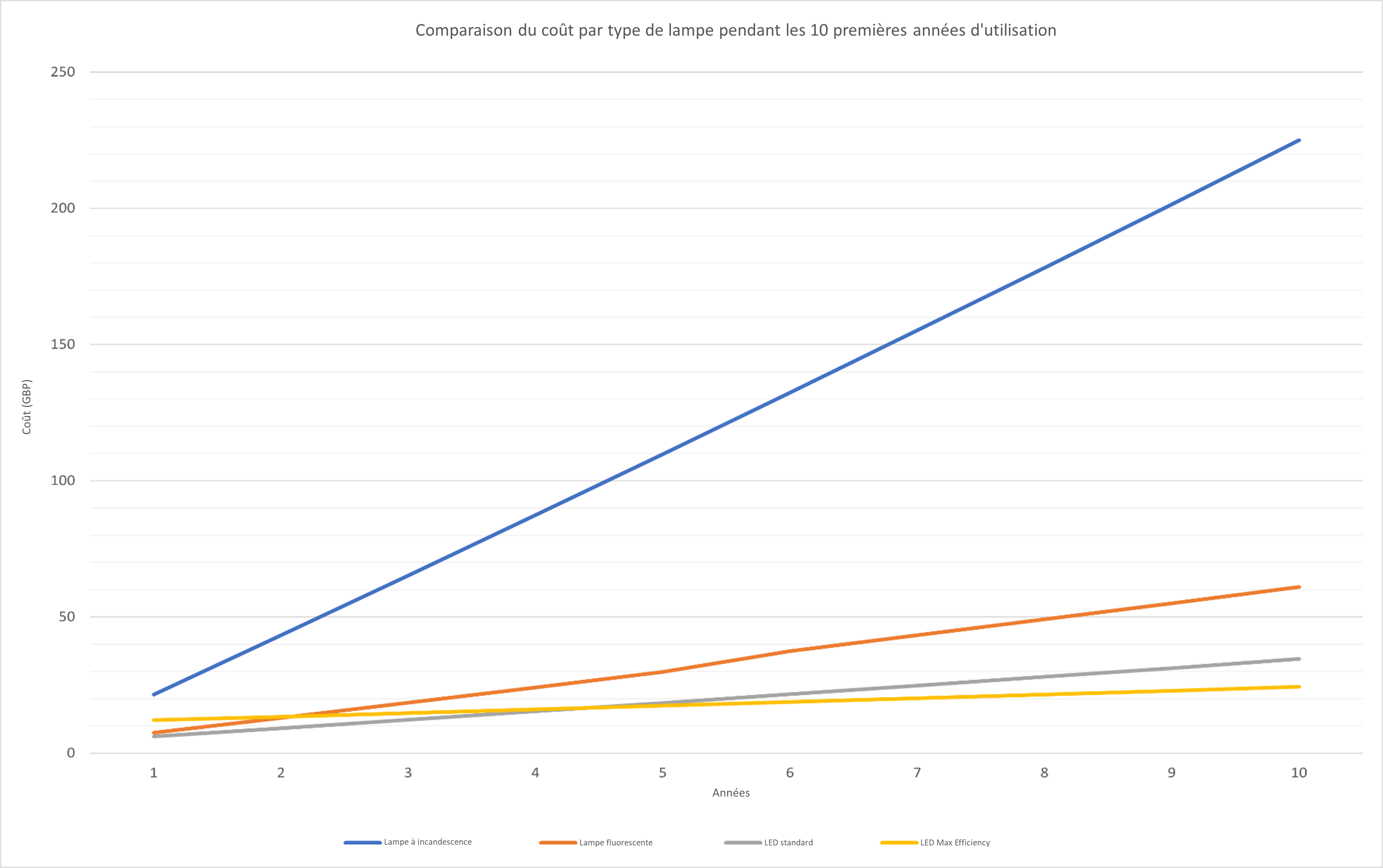 Comparaison du coût par type de lampe pendant les 10 premières années d'utilisation