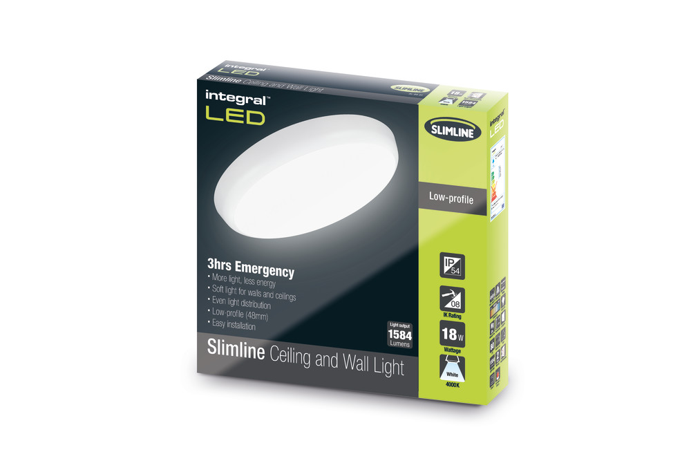 L'applique murale et plafonnier basse consommation Integral LED 18W délivre 1584 lumens, une température de couleur blanche de 4000K. Son design LED rétro-éclairé offre un angle de faisceau de 120 degrés et une répartition uniforme de la lumière. Le plafonnier et applique murale Integral IP54 Slimline a une profondeur de profil bas de seulement 48 mm et convient à toutes les zones intérieures telles que les couloirs, les escaliers, les murs et les plafonds, y compris les salles de bains (zones 2 et 3) et les zones extérieures couvertes (abritées), telles que porches. Fabriqué en polycarbonate résistant et de haute qualité. Longue durée de vie de 40 000 heures basée sur une utilisation normale. Chaque unité est fournie avec un support d'installation facile et un guide d'installation facile à suivre. Son pack d'urgence INTEGRAL améliore l'installation et la maintenance faciles. Une fois installé, en cas de panne de courant, le plafonnier / applique continuera à fournir de la lumière (300 lumens) pendant au moins 3 heures. Une lumière LED verte constante est visible depuis le boîtier avant pour indiquer que le mode d'urgence est fonctionnel.