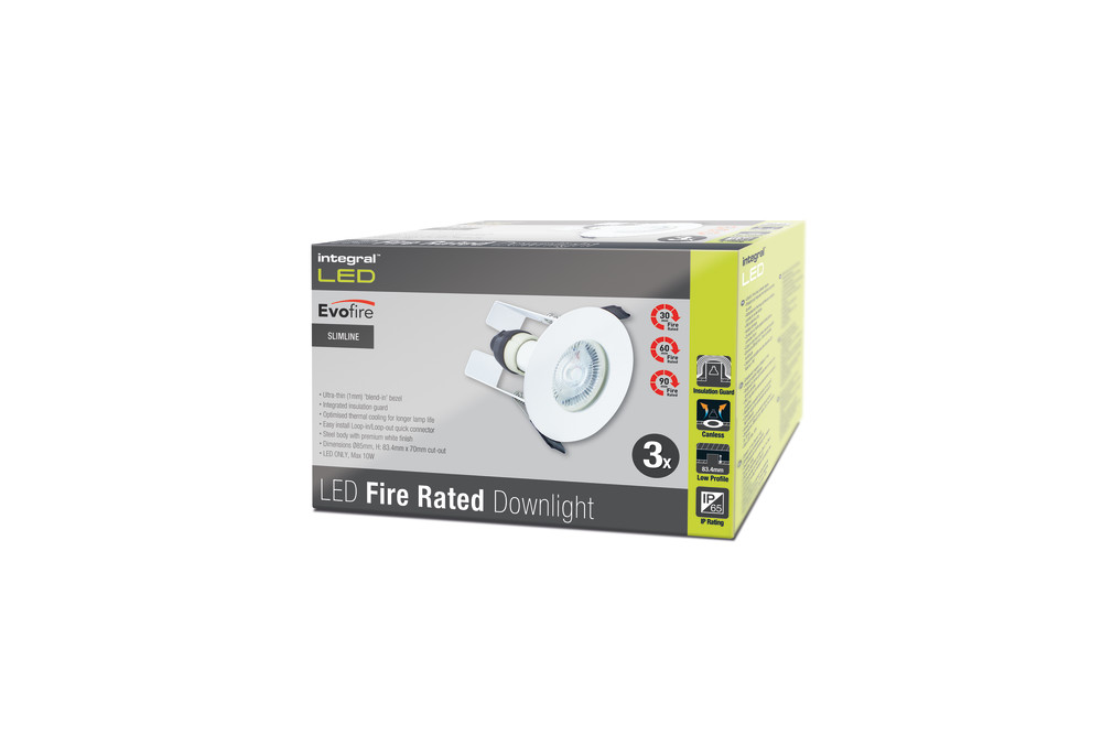 EVOFIRE 85 FIRE RATED DOWNLIGHT 70MM CUTOUT 3PACK IP65 WHITE ROUND +GU10 HOLDER & INSULATION GUARD INTEGRAL